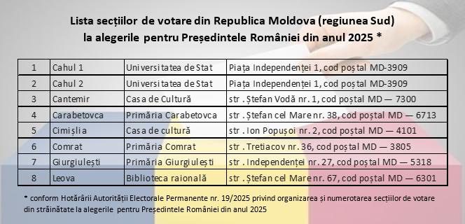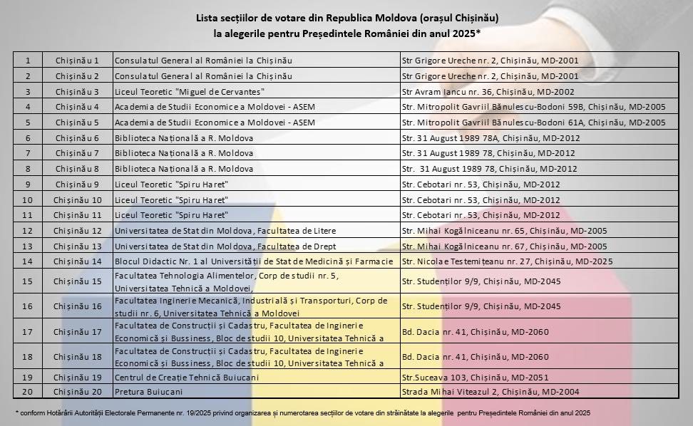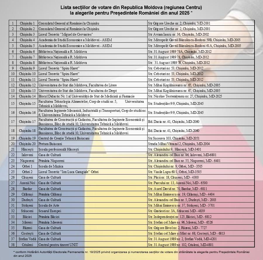 64 de secții de votare pentru alegerea președintelui României vor fi organizate pe teritoriul Republicii Moldova. Majoritatea vor fi amenajate în centrul țării – 38 de secții, la nord – 18, iar la sud – 8.