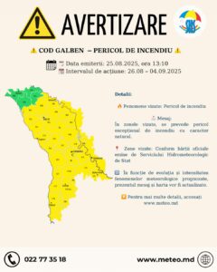 Serviciul Hidrometeorologic de Stat a emis Cod Galben pericol de incendiu aproape în toate localitățile din țară. Acesta va intra în vigoare pe 26 august și va fi valabil până pe 4 septembrie.
