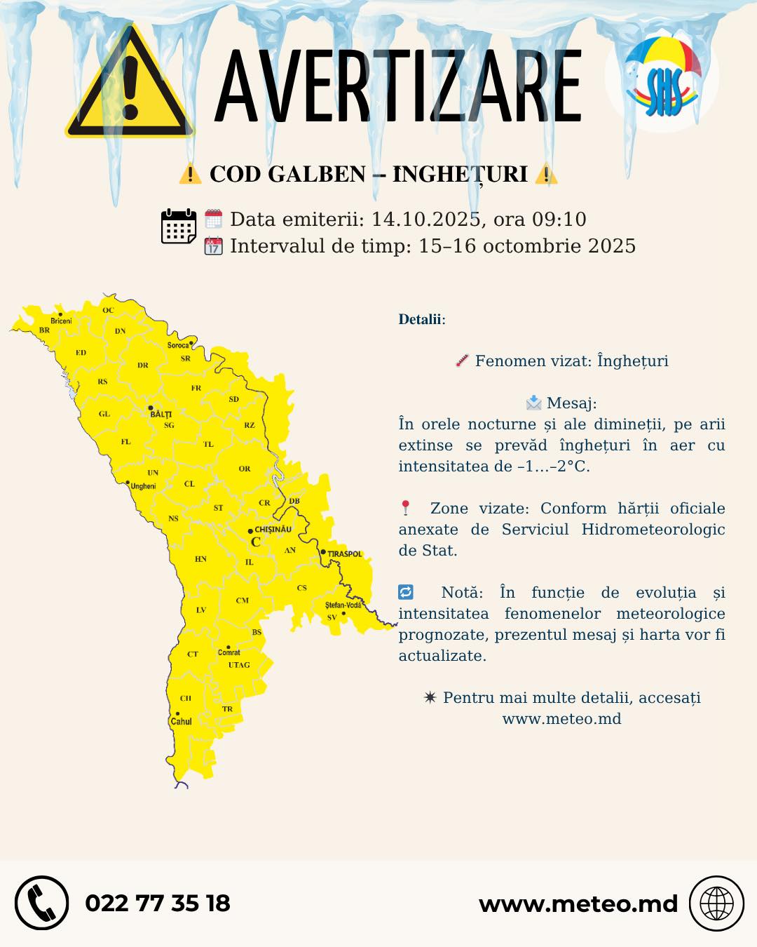 Serviciul Hidrometeorologic de Stat avertizează că în noaptea de 15 spre 16 octombrie în Republica Moldova va fi înregistrat Cod Galben de îngheț. Acesta este preconizat pentru întreg teritoriul țării.
