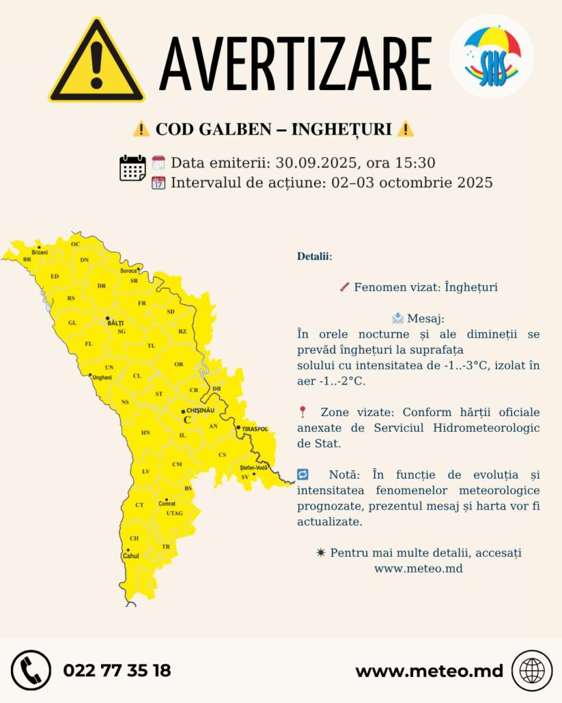 Serviciul Hidrometeorologic de Stat avertizează despre un nou Cod Galben de îngheț. Acesta este preconizat  pentru noaptea de 2 spre 3 octombrie, pe întreg teritoriul țării.