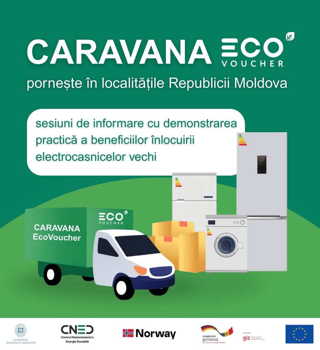 Amintim că, Programul Ecovoucher a fost dezvoltat de Guvernul Republicii Moldova cu sprijinul Uniunii Europene. Această ediție a Programului de Vouchere pentru Electrocasnice este implementată de Centrul Național pentru Energie Durabilă în cadrul proiectului „Eficiență Energetică și Energii Regenerabile pentru Moldova” (E4M). E4M este un proiect implementat de GIZ împreună cu Guvernul Republicii Moldova, finanțat de Guvernul Germaniei și cofinanțat de Uniunea Europeană, Norvegia și Danemarca. Ediția curentă a Programului de Vouchere pentru Electrocasnice este finanțată de Norvegia. Caravana EcoVoucher este susținută de Guvernul Germaniei și Uniunea Europeană.