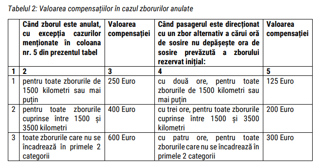 Valoarea compensațiilor la care pot pretinde pasagerii care au parte de zboruri anulate este reflectată în Tabelul 2.
