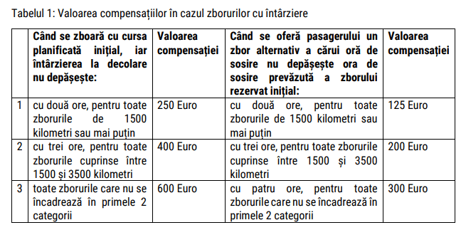 Valoarea compensațiilor ce poate fi solicitată de la compania avia care deservește zborul poate varia de la 250 la 600 Euro, iar valoarea dată poate fi redusă la jumătate în condițiile în care pasagerului i se propune o cursă alternativă în condițiile specificate în Tabelul 1.