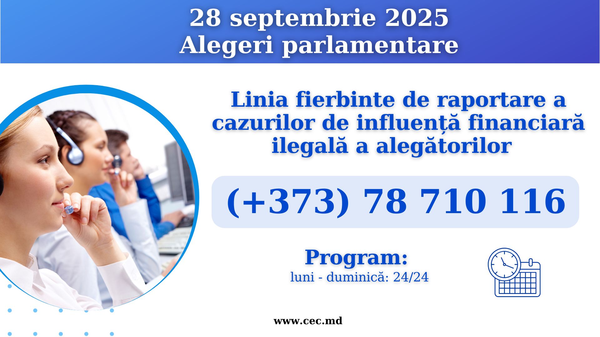 Comisia Electorală Centrală, în colaborare cu Centrul Național Anticorupție, a lansat o Linie Fierbinte pentru raportarea cazurilor de corupere electorală la alegerile din 28 septembrie. Decizia vine în urma multiplelor sesizări privind tentative de corupere a alegătorilor și atragerea acestora în scheme obscure. Cetățenii sunt îndemnați să sesizeze asemenea situații la numărul de telefon +373 78 710 116.