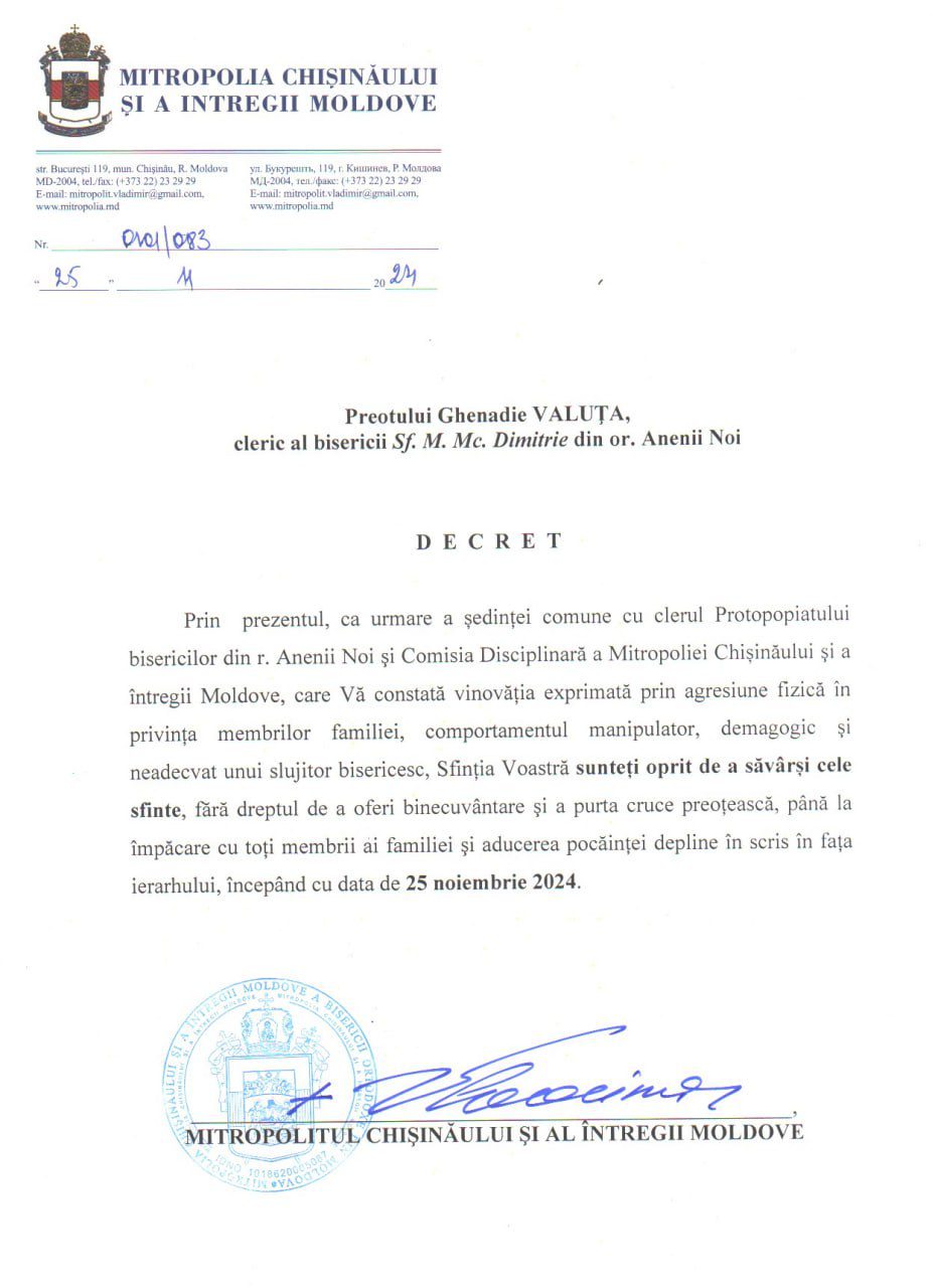 Preotul Ghenadie Valuța, clericul bisericii ”Sf. M. Mc. Dimitrie” din or. Anenii Noi, a fost oprit de Mitropolia Moldovei de la săvârșirea celor sfinte, fără dreptul de a oferi binecuvântare și a purta cruce preoțească, începând cu data de 25 noiembrie, curent.