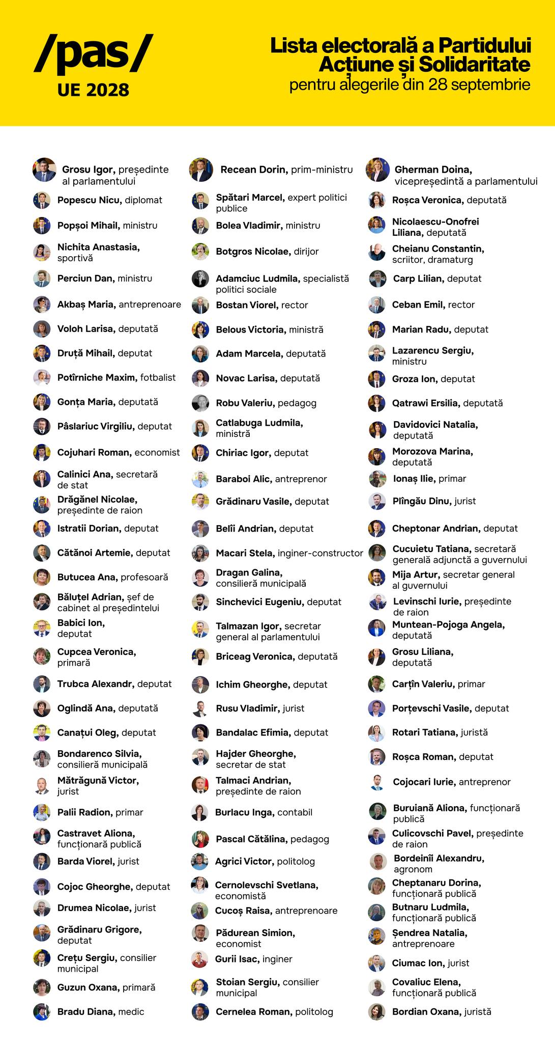 Partidul Acțiune și Solidaritate (PAS) a făcut publică lista candidaților cu care va participa la alegerile parlamentare din 28 septembrie. Decizia a fost luată în cadrul ședinței Consiliului Politic Național al formațiunii.
