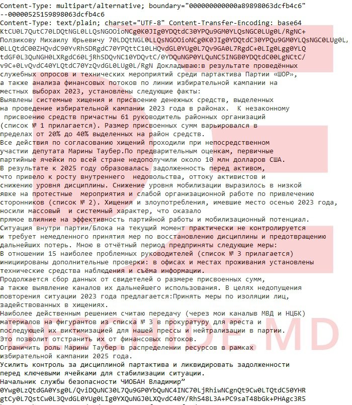 Reporterii noștri au intrat în posesia unui raport, expediat pe 2 mai de Vladimir Cioban către Mihail Polzikov – oficial de rang înalt în Direcția 5 a FSB, responsabilă de colectarea informațiilor operative și de coordonarea relațiilor internaționale în domeniul securității și spionajului. În raport, Cioban detaliază situația din cadrul blocului și afirmă că în spatele furturilor s-ar afla chiar Marina Tauber, considerată „mâna dreaptă” a lui Șor.