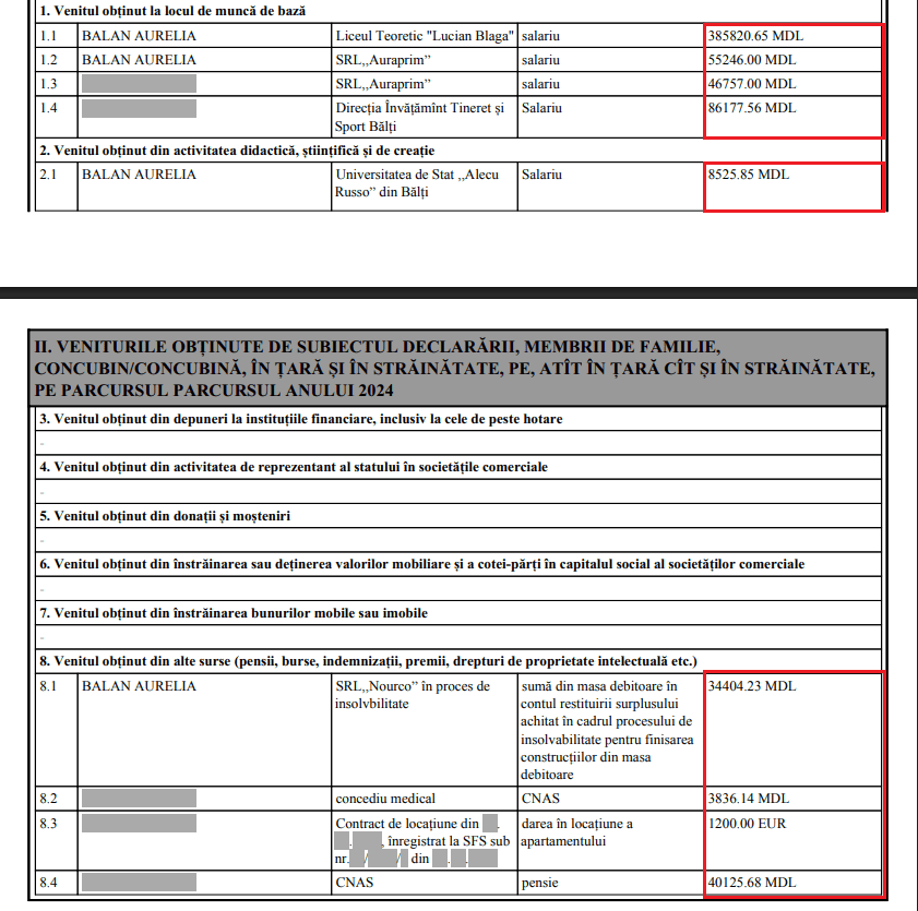 Mai exact, 287 562 de lei au fost obținuți de către Svetlana Oserbaeva din activitatea didactică, în timp ce peste 74 000 de lei reprezintă venitul soțului său care activează în cadrul Întreprinderii de Stat pentru Silvicultură Bălți. Acesta a beneficiat și de o pensie din partea Casei Naționale de Asigurări Sociale, în valoare de peste 159 000 de lei.