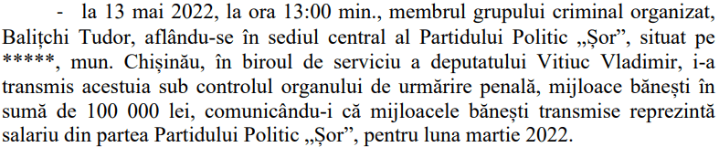 Potrivit documentului, „declarațiile martorului Vitiuc Vladimir, care în cadrul ședinței de judecată după depunerea jurământului potrivit art. 108 din Codul de procedură penală, au fost apreciate drept pertinente și relevante pentru cauză”. Instanța notează că fostul parlamentar a oferit detalii esențiale despre modul în care se efectuau plățile neoficiale în interiorul Partidului „Șor”.