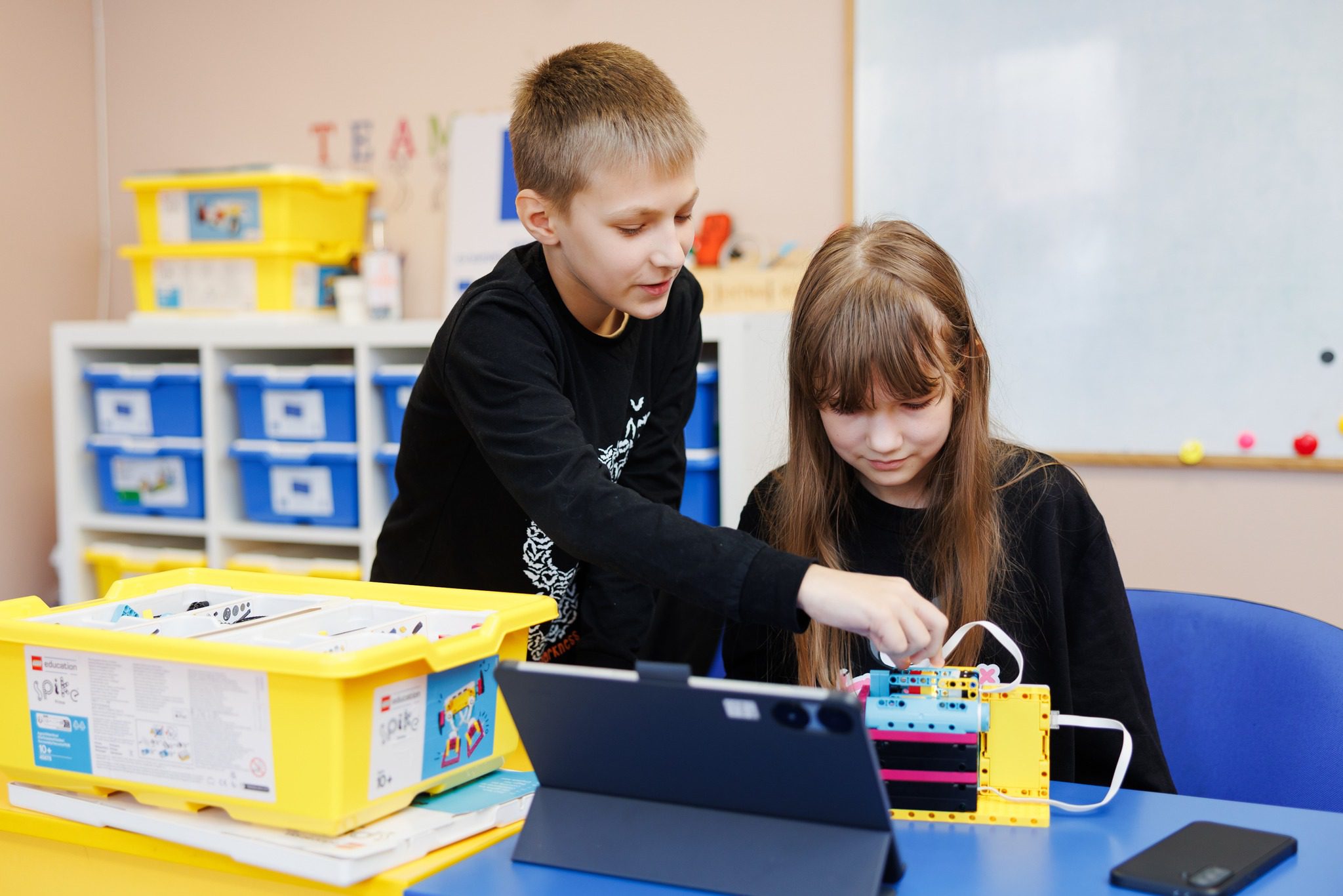 Victor, 10 ani, este unul dintre elevii ei: „Aici facem roboți din LEGO și îi programăm să facă diferite mișcări. N-a fost complicat să învățăm asta, pentru că pe tabletă este arătat pas cu pas cum ar trebui să construim. Aș vrea și la școală să avem așa lecții, pentru că e interesant și nu ia chiar atât de mult timp”, spune Victor.