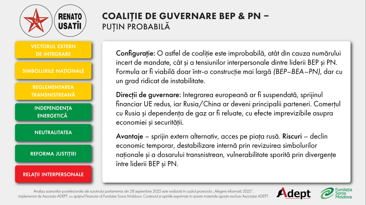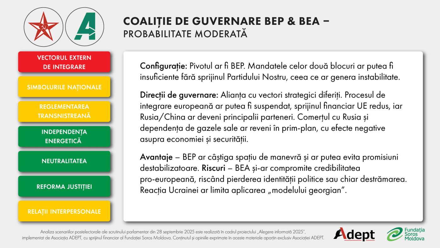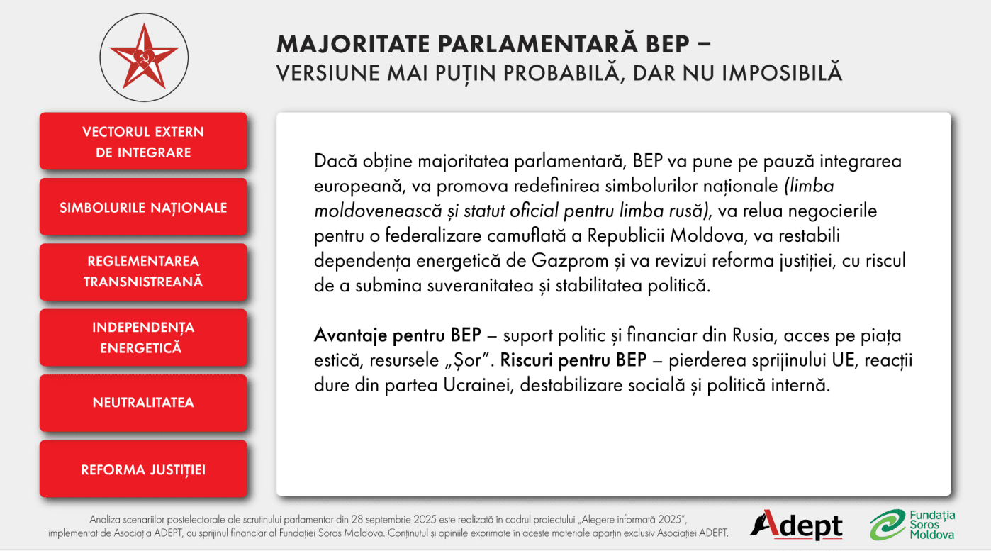 De cealaltă parte, o versiune mai PUȚIN PROBABILĂ, dar nu imposibilă este o majoritate parlamentară BEP. Asta ar însemna pentru țara noastră o pauză la capitolul integrare europeană și o restabilire a dependenței energetice a Moldovei de Gazprom.