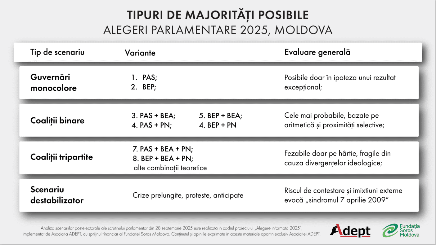 Pentru că niciun partid și niciun bloc electoral nu ar acumula mai mult de jumătate din voturi, ADEPT a realizat și o prognoză cu privire la tipurile de majorități posibile.
