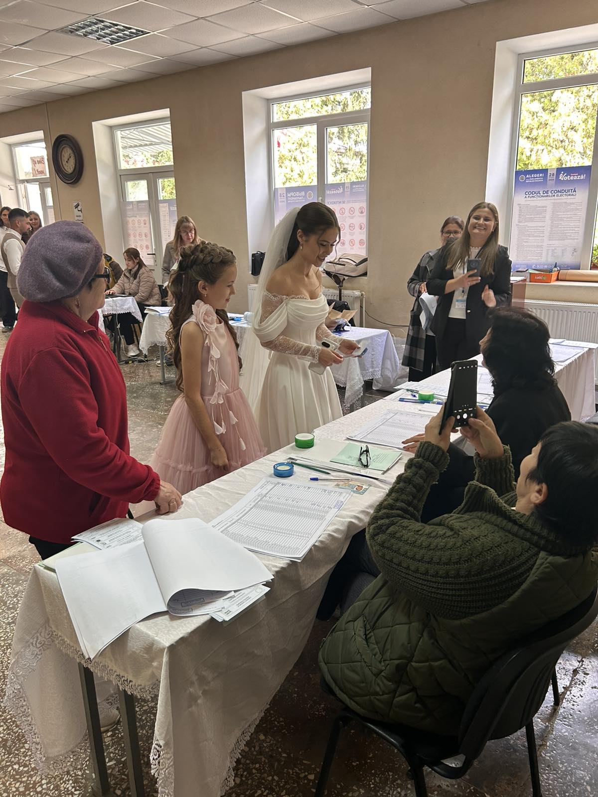 FOTO // Două voturi pentru dragoste și viitor. Mire și mireasă din raionul Fălești au trecut pe la urna de vot înainte de petrecerea de nuntă