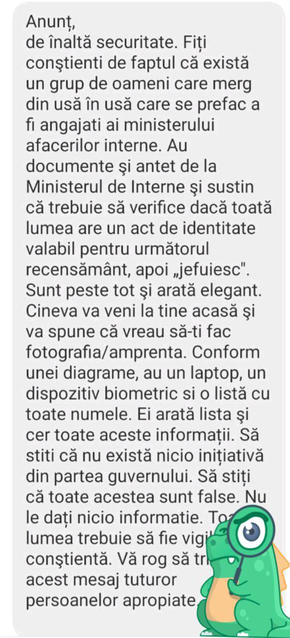 Poliția Națională informează că în spațiul public circulă un mesaj conform căruia anumite persoane care se prezintă drept angajați ai instituțiilor statului ar umbla pe la casele cetățenilor și ar colecta date personale, ulterior jefuindu-i.