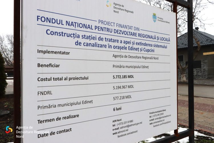 Valoarea totală a proiectului „Construcția stației de tratare a apei și extinderea sistemului de canalizare în orașele Edineț și Cupcini” constituie 5,76 mil. lei, din care 5,18 mil. lei – din sursele Fondului Național pentru Dezvoltare Regională și Locală și 575,85 mii lei – contribuția Primăriei municipiului Edineț.