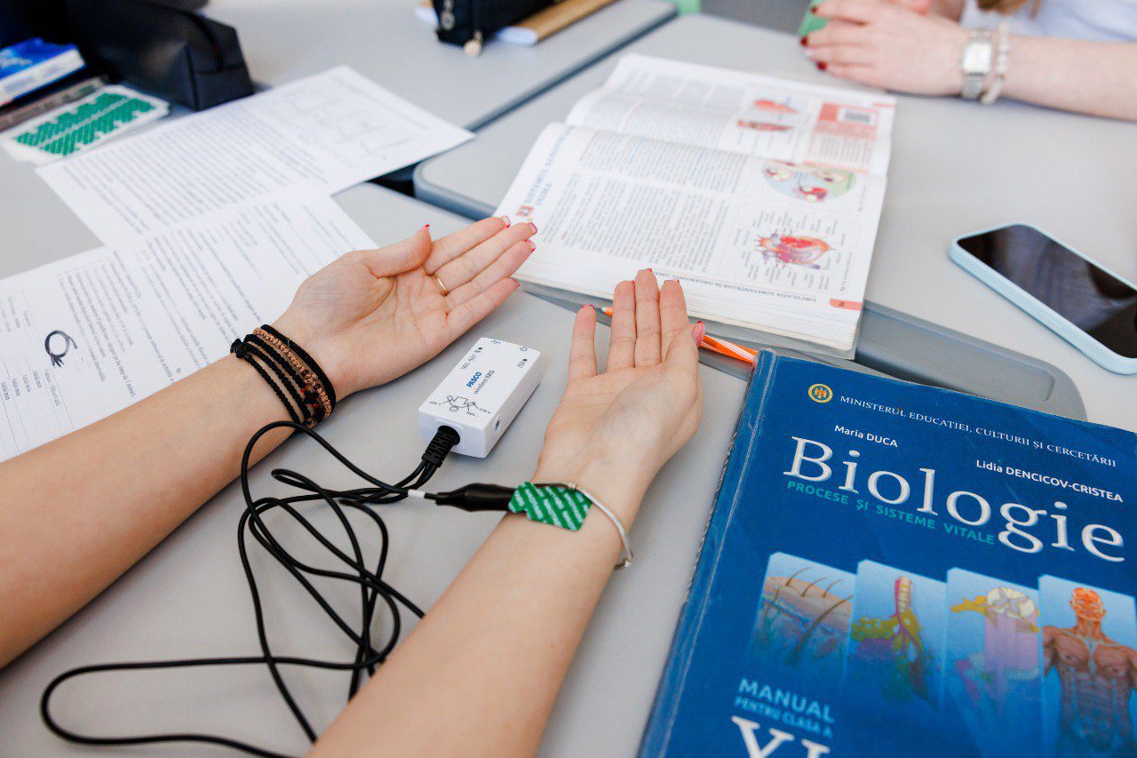 La Liceul „Mihail Sadoveanu” din Ocnița, orele de biologie au trecut dincolo de manuale. Elevii învață cum funcționează corpul uman folosind senzori biologici conectați la încheietura mâinii, care transmit în timp real date pe calculator.