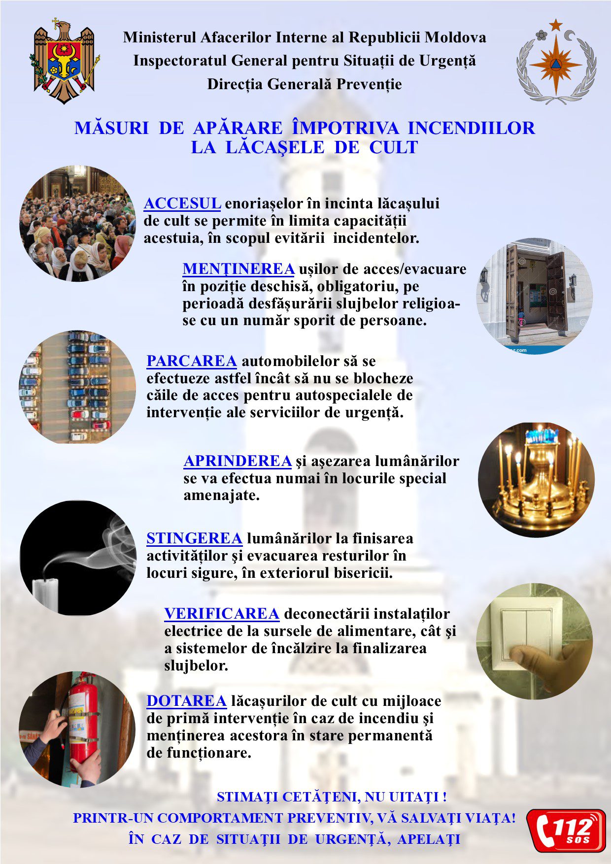 - Asigurarea lăcaşelor sfinte cu mijloace primare de stingere a incendiilor, cât şi instruirea corespunzătoare a întregului personal pentru reacţionarea promptă pentru stingerea cu forţe proprii a unui eventual incendiu izbucnit până la sosirea serviciului de salvatori și pompieri.