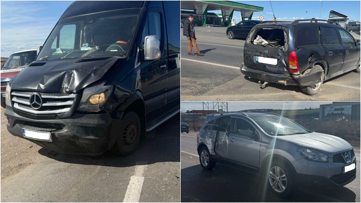 Potrivit oamenilor legii, în accident au fost implicate un autoturism de model Nissan, un Opel, dar și un microbuz de model Mecedes.