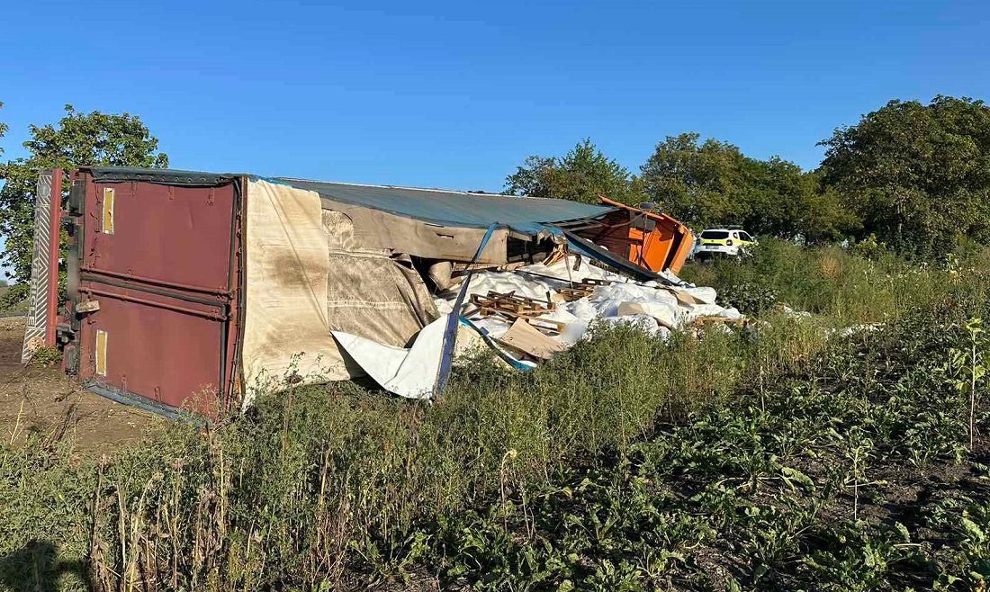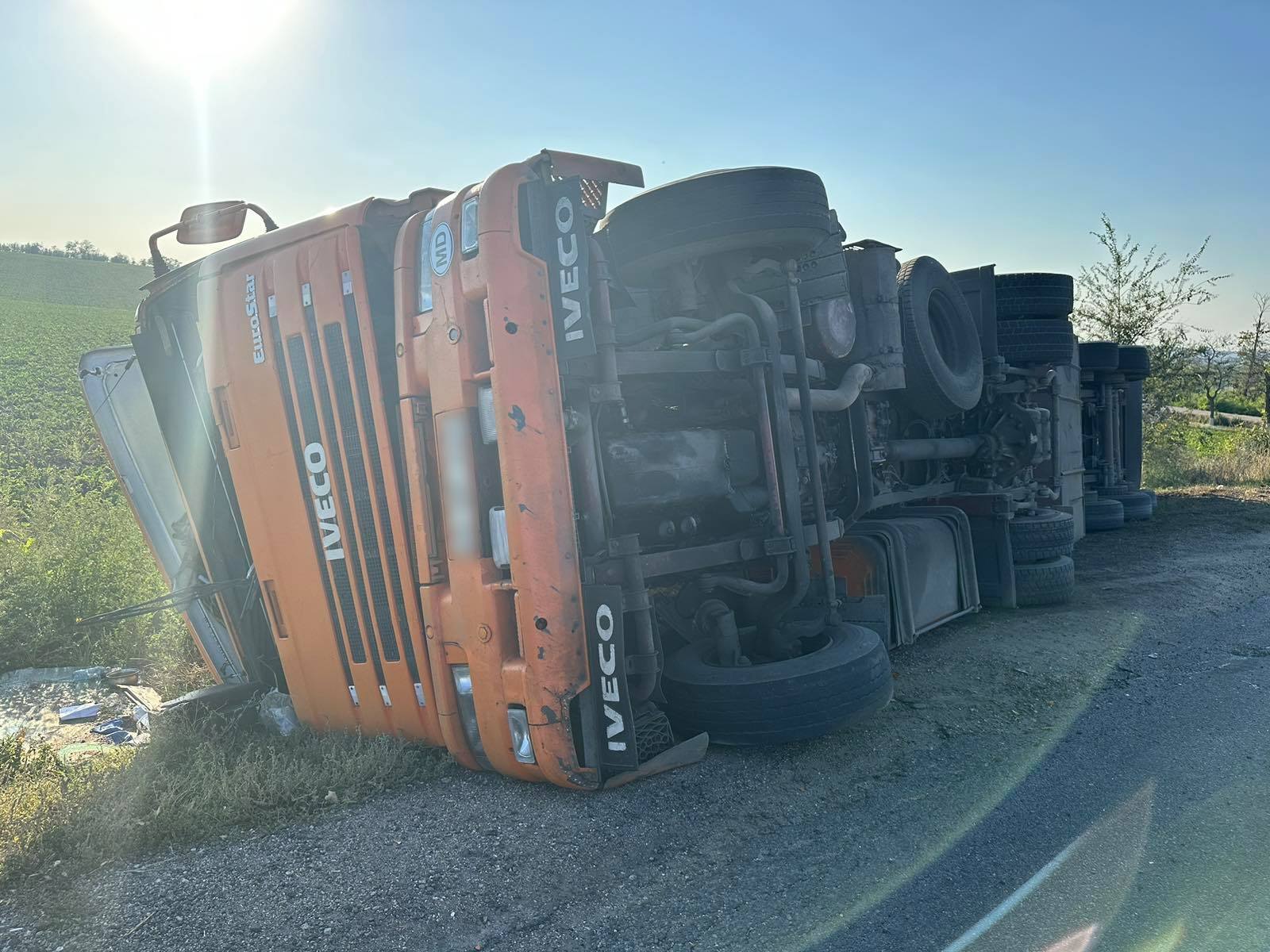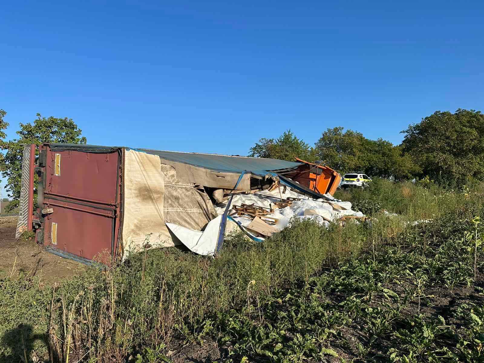 Accident grav în nordul țării. Un camion de model Iveco care tracta o semiremorcă încărcată cu 22 de tone de saci cu zahăr s-a răsturnat. De vină s-ar face șoferul care a pierdut controlul vehiculului.