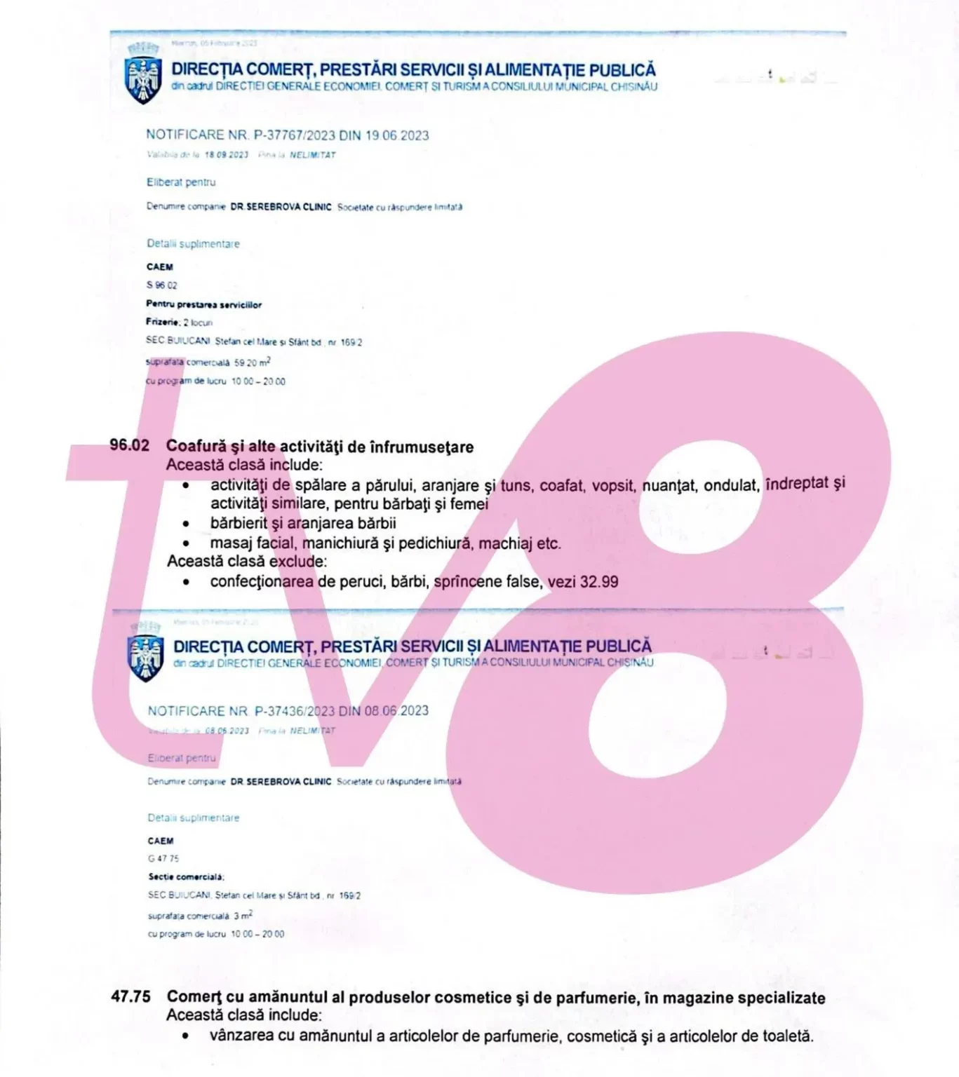 Prima autorizație pentru compania „DR. SEREBROVA CLINIC” a devenit valabilă din vara anului 2023 și permitea doar comerțul cu amănuntul al produselor cosmetice și de parfumerie. A doua autorizație a fost eliberată companiei în toamna aceluiași an pentru activități legate de coafat, tuns, bărbierit, manichiură și pedichiură sau machiaj și masaj facial.
