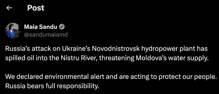 „Atacul Rusiei asupra hidrocentralei Novodnistrovsk din Ucraina a provocat o scurgere de petrol în râul Nistru, punând în pericol aprovizionarea cu apă a Moldovei. Am declarat alertă de mediu și acționăm pentru a ne proteja oamenii. Rusia poartă întreaga responsabilitate”, a scris șefa statului.