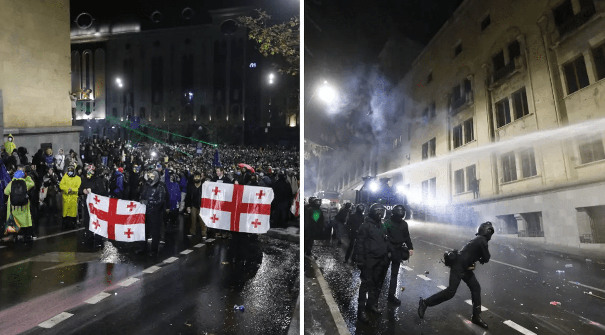 Mii de manifestanți pro-europeni s-au adunat, vineri, în centrul capitalei Tbilisi, după ce partidul de guvernământ din Georgia a anunțat că îngheață negocierile la UE, până în 2028. Poliția a intervenit în forță cu tunuri cu apă și gaze lacrimogene, scrie Libertatea.