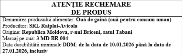 Agenția Națională pentru Siguranța Alimentelor (ANSA) anunță retragerea de pe piață a unui lot de ouă pentru consum, de la o avicolă din nordul țării. Este vorba despre ouă de găină cu marcajul 3 MD BR 004, având data durabilității minimale cuprinsă între 10 ianuarie și 27 ianuarie 2026, inclusiv.
