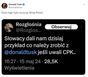 „Au fost multe din acestea ieri”, a scris joi Tusk într-o postare pe platforma X (fosta Twitter) pe care a ilustrat-o cu o captură de ecran a unui comentariu, postat miercuri pe X, ce afirma: „Astăzi, slovacii ne-au dat un exemplu despre ce ar trebui făcut cu Donald Tusk” dacă el decide să nu facă investiţii într-un mare aeroport din centrul Poloniei.