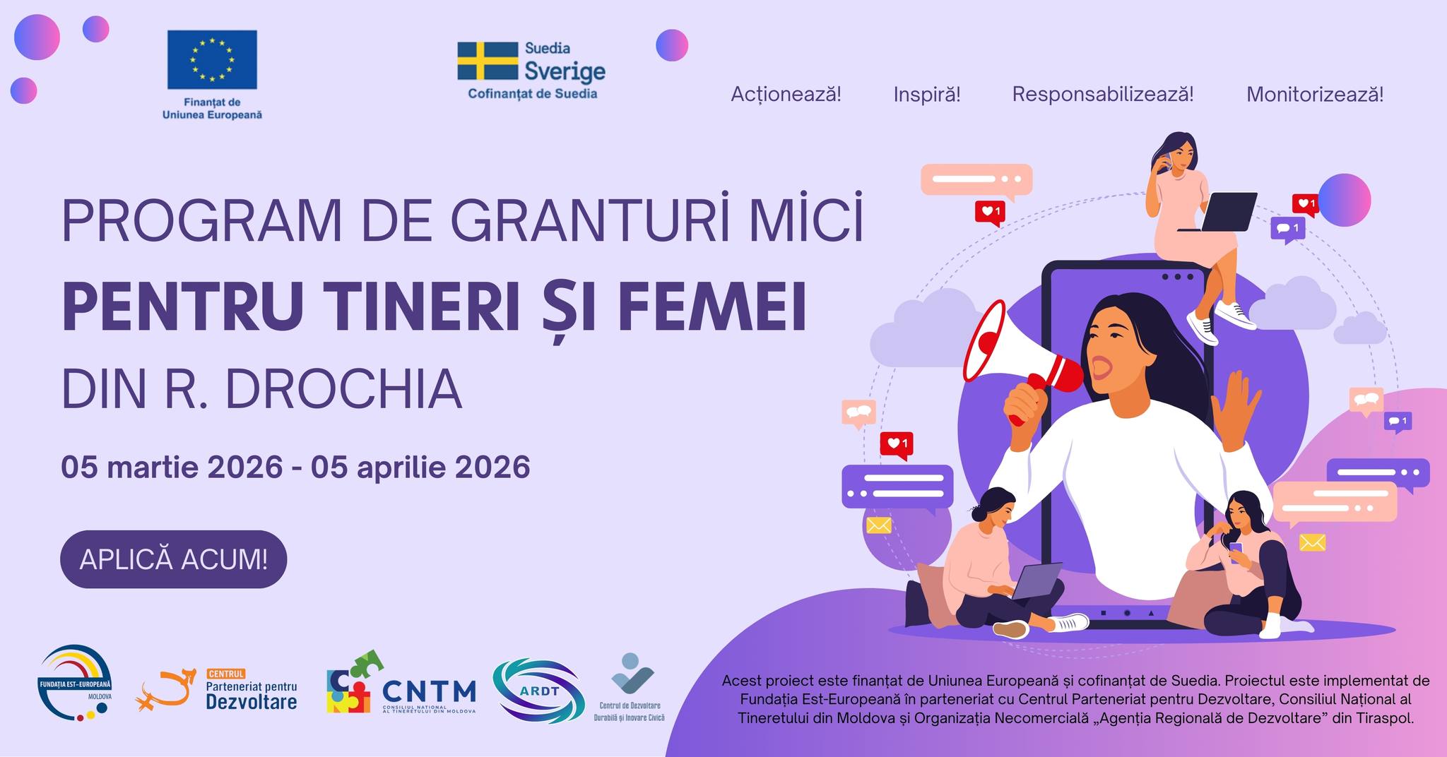 Centrul de Dezvoltare Durabilă și Inovare Civică a anunțat lansarea Programului de Granturi Mici destinat tinerilor și femeilor din raionul Drochia. Programul are scopul de a sprijini înființarea și dezvoltarea cluburilor cetățenești în comunitățile rurale.