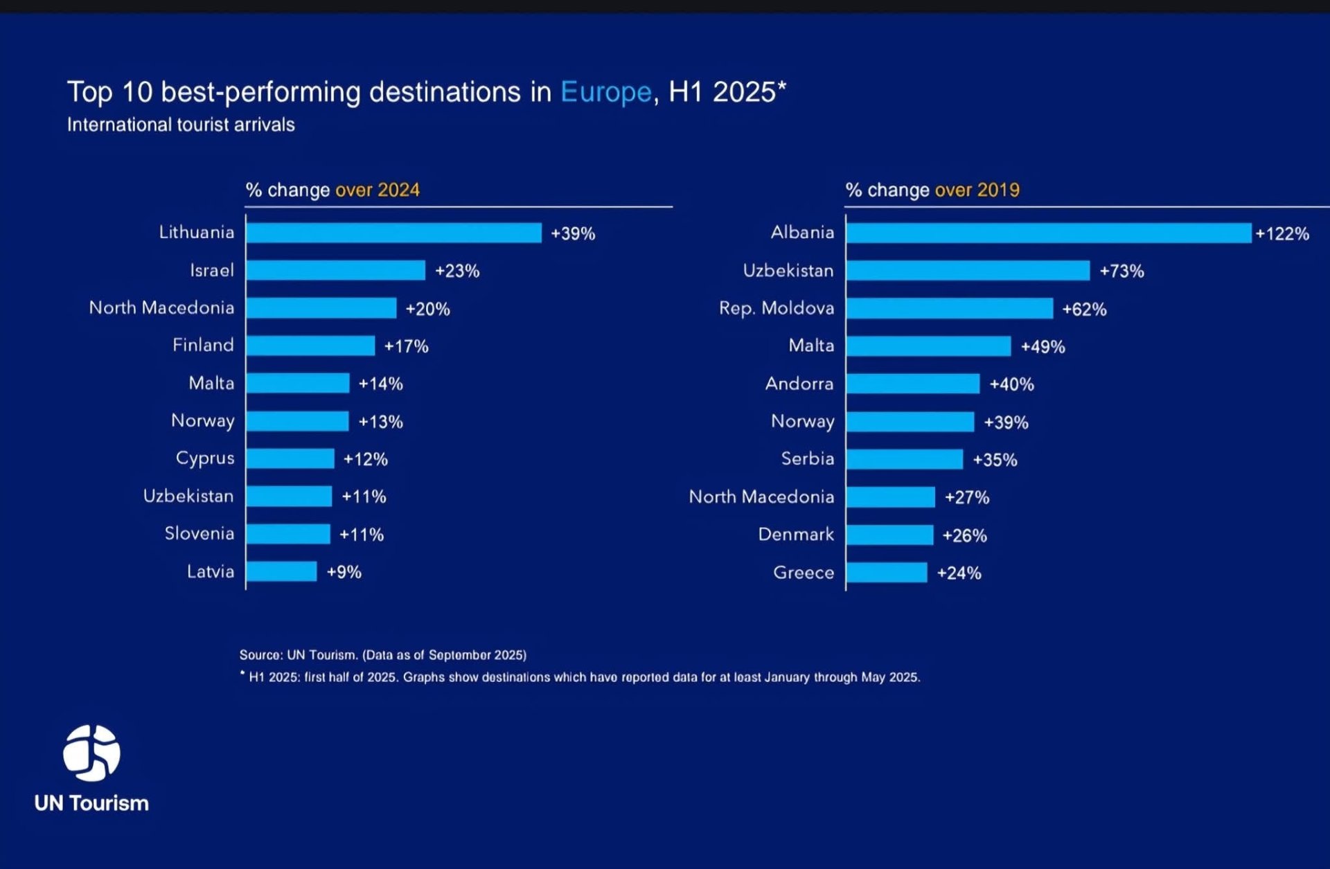 Republica Moldova se află în Top 10 destinații europene cu cele mai bune performanțe turistice în prima jumătate a anului 2025, potrivit datelor publicate de Organizația Mondială a Turismului (UN Tourism), scrie moldpres.