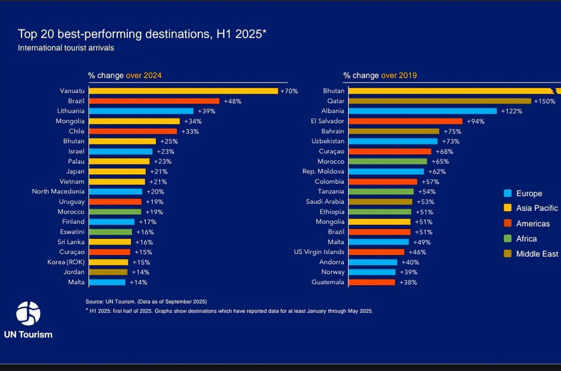 Datele indică o creștere de 62% a sosirilor internaționale comparativ cu perioada pre-pandemică din 2019, depășind mai multe destinații consacrate din regiune. Evoluția evidențiază potențialul țării de a deveni o destinație turistică atractivă, sigură și orientată spre durabilitate.