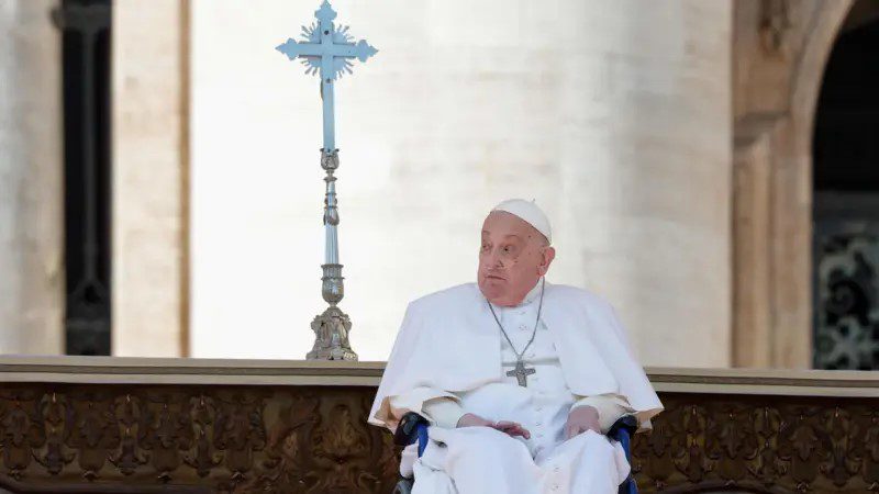 Папа ненадолго появился на сцене в инвалидном кресле, с дыхательной трубкой под носом, сообщает BBC.