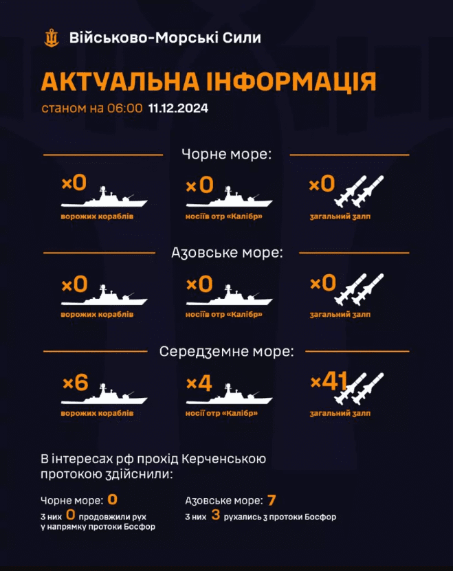 Potrivit marinei ucrainene, în Marea Mediterană există în prezent șase nave inamice, dintre care 4 sunt purtătoare de rachete de croazieră Kalibr cu o salvă totală de până la 41 de rachete.