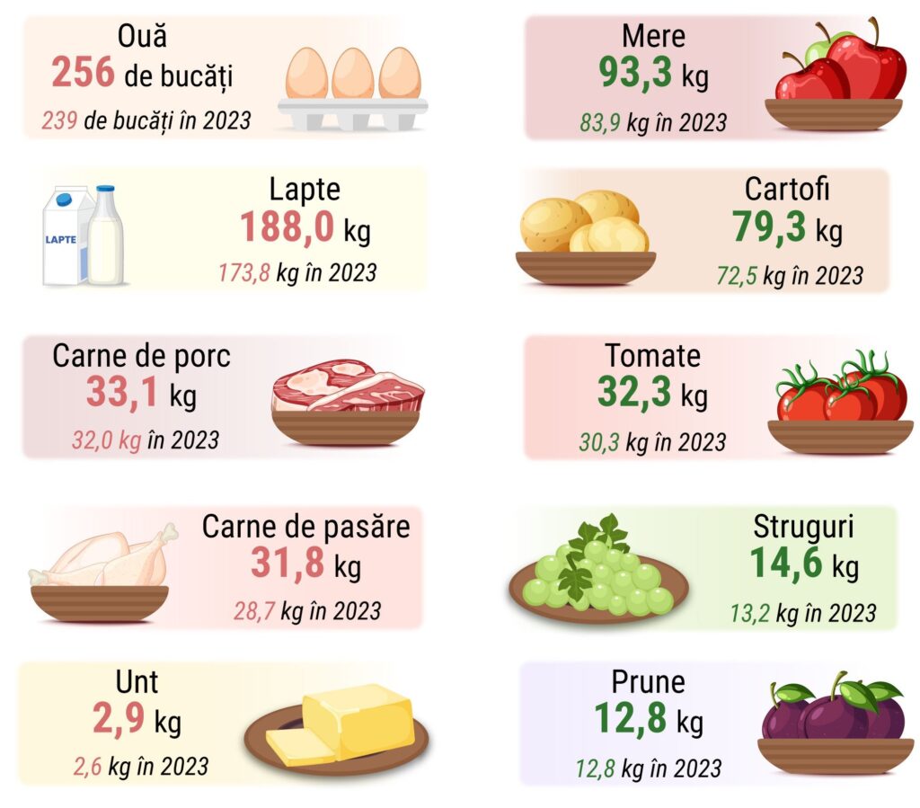 În schimb, consumul de cartofi a crescut la 79,3 kg per persoană, cu 9% mai mult față de 2023. Și consumul de lapte a înregistrat o creștere de 8%.