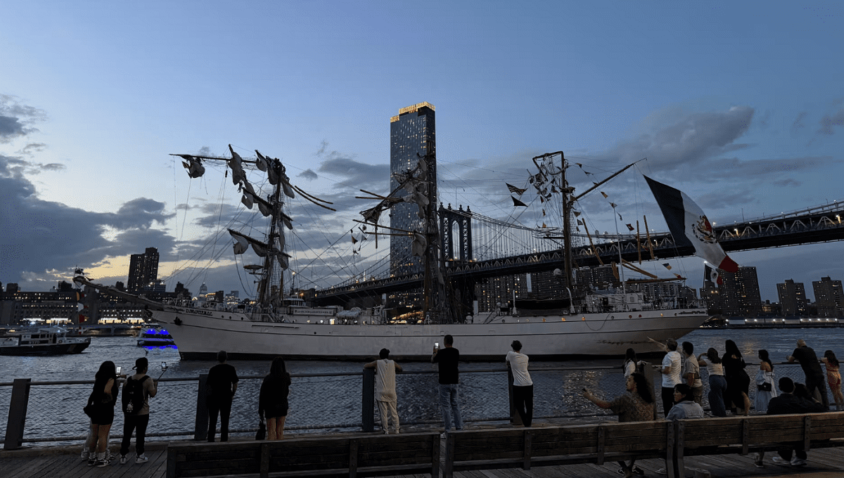 Videoclipurile postate online au arătat nava de antrenament Cuauhtemoc în timp ce se apropia de podul emblematic peste East River, aproape de Manhattan, care leagă cartierul de Brooklyn. Catargele sale de peste 45 de metri au fost prea înalte pentru a putea să treacă pe sub podul arcuit în acel punct și au fost retezate atunci când vasul, numit după ultimul împărat aztec, a încercat să treacă pe sub pod.