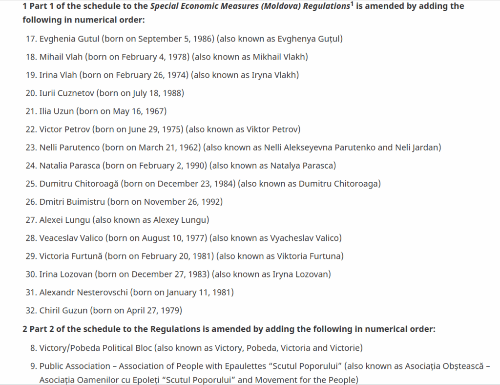 În listă este inclusă și președinta partidului „Moldova Mare”, Victoria Furtună, jurnalistul Dmitri Buimistru, activistul Veaceslav Valico, liderul Partidului „Șansă”, Alexei Lungu, precum și deputații fugari Alexandr Nesterovschi și Irina Lozovan. Cele două entități sancționate sunt: Blocul politic „Victorie” și Asociația Oamenilor cu Epoleți „Scutul Poporului”.